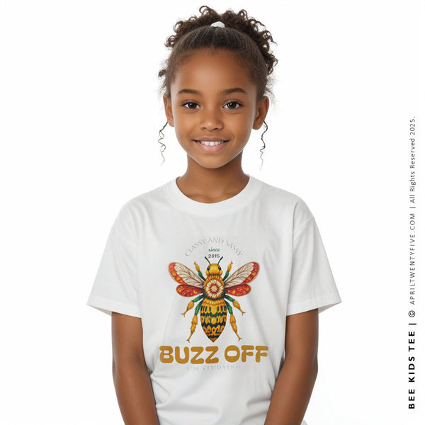 For little scholars with big personality, this crisp white tee keeps it classy, sassy, and smart. Front and center, a vibrantly illustrated bee buzzes beneath the playful phrases: “CLASSY AND SASSY since 2015” and “BUZZ OFF I’M STUDYING.” It’s a cheeky celebration of focus, confidence, and a dash of humor—perfect for kids who take their school spirit seriously, with a wink.