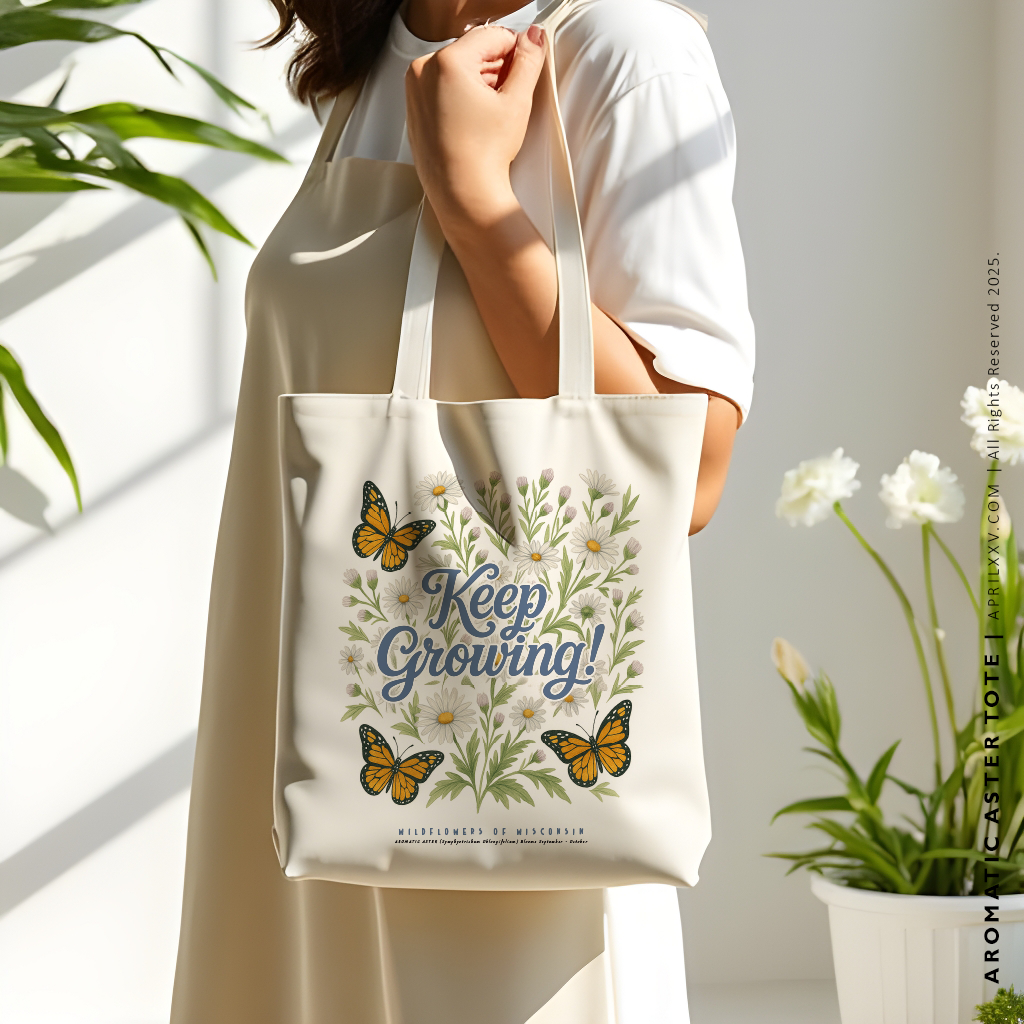 Embrace the beauty of Wisconsin's prairies with this tote bag inspired by the enchanting Aromatic Aster. Known for its vibrant purple-blue petals and delicate fragrance, this resilient wildflower is a late-season pollinator favorite, offering vital support to butterflies and bees as summer transitions into autumn. Perfect for everyday outings or as a statement piece, this tote is not just practical—it's a celebration of Wisconsin's stunning native flora and its ecological significance.
