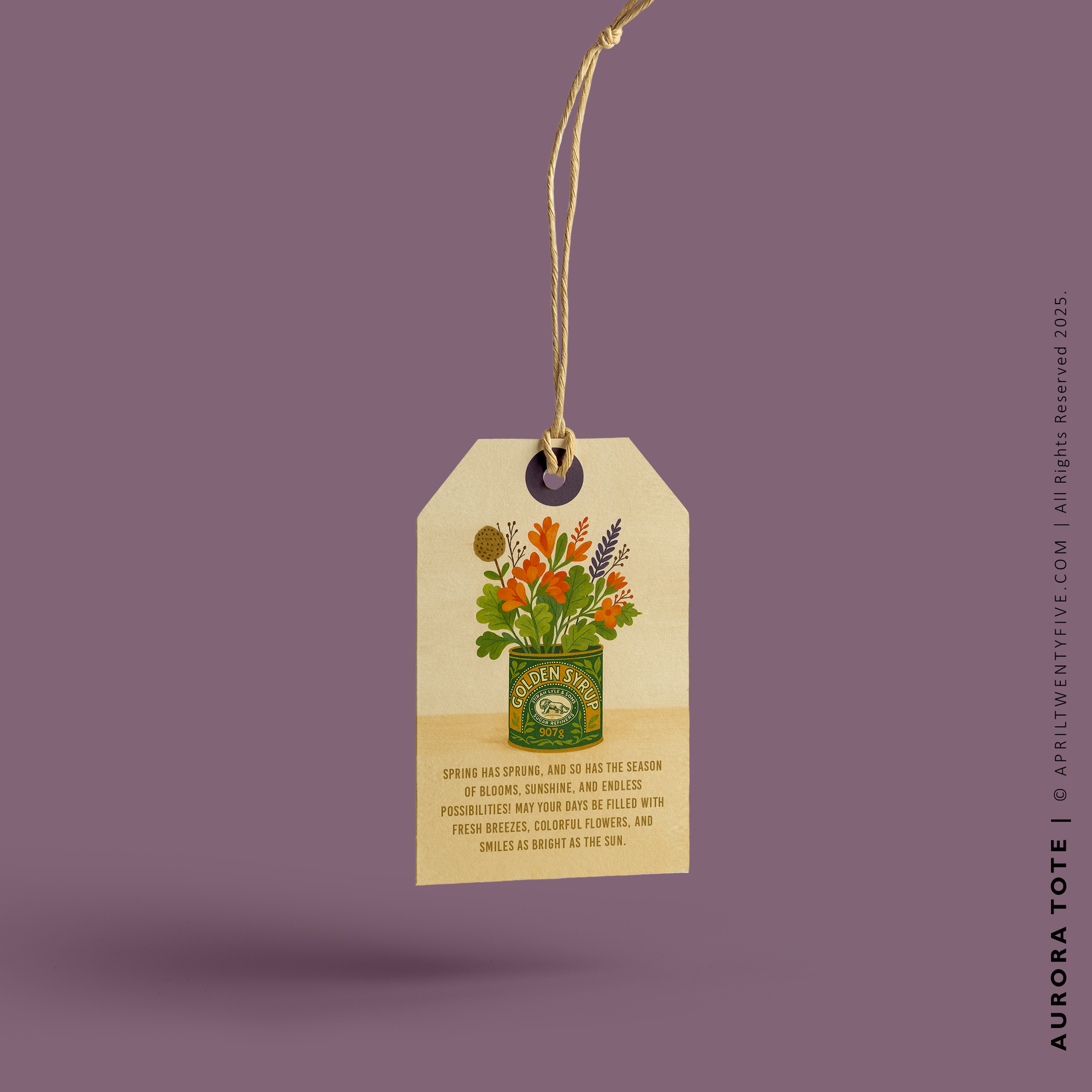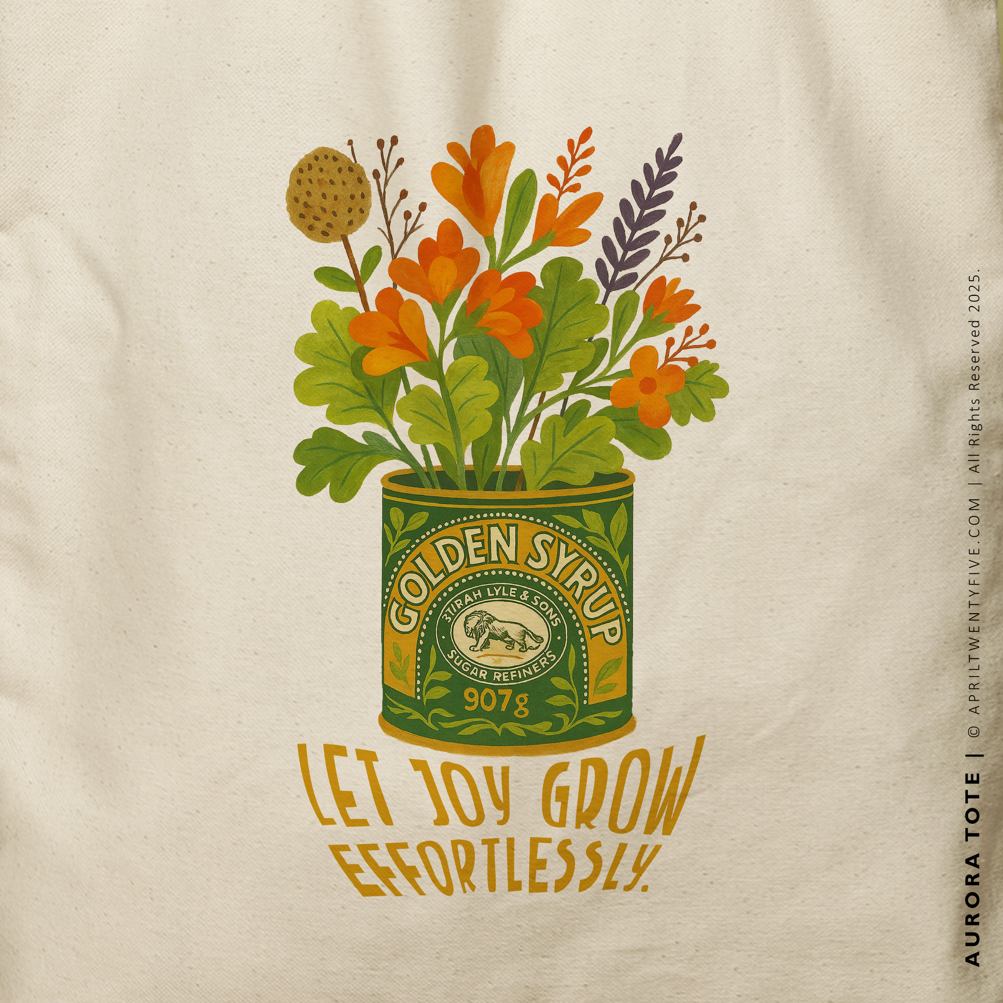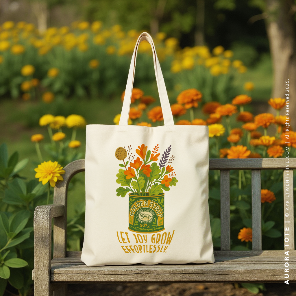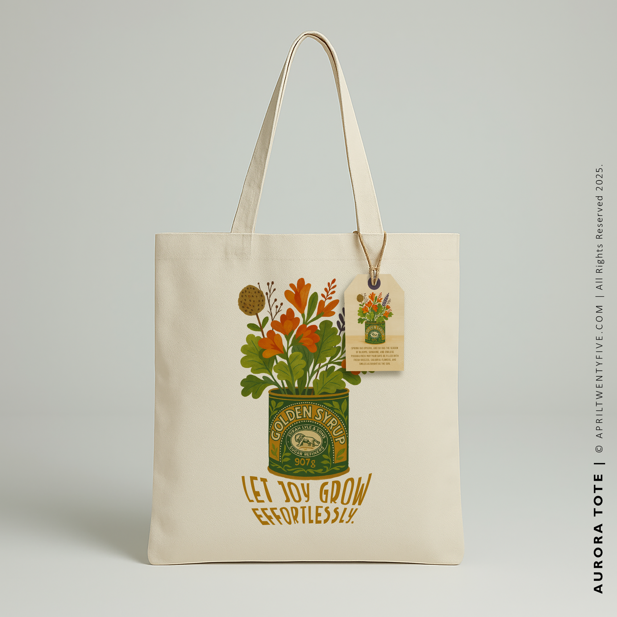 Unveiling the Aurora Tote—where practicality meets beauty in every detail. This eco-conscious tote features a stunning design of vibrant orange and green flowers arranged in a vintage Golden Syrup tin, symbolizing effortless charm and timeless elegance. Below the captivating floral artwork, the inspirational phrase 'Let Joy Grow Effortlessly' adds a positive touch to your everyday carry. Crafted for durability and style, this tote is ideal for grocery shopping, carrying books, or transporting essentials with flair. Exclusively designed by April Twenty-Five, the Aurora Tote isn't just a bag—it's a statement of joy and sustainability. Shop now and let your joy flourish effortlessly!
