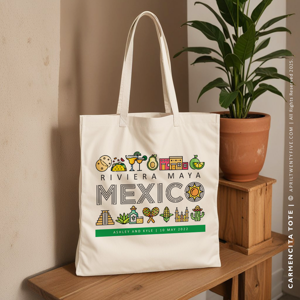 Fiesta time! This colorful and festive tote bag is perfect for your next celebration. With Mexican travel icons in a festive array of colors, this bag is sure to bring the party with you. Perfect for a day at the beach, a trip to the market, or a night on the town, this tote bag is a must-have for your next event. And it also makes the perfect gift or wedding favor.