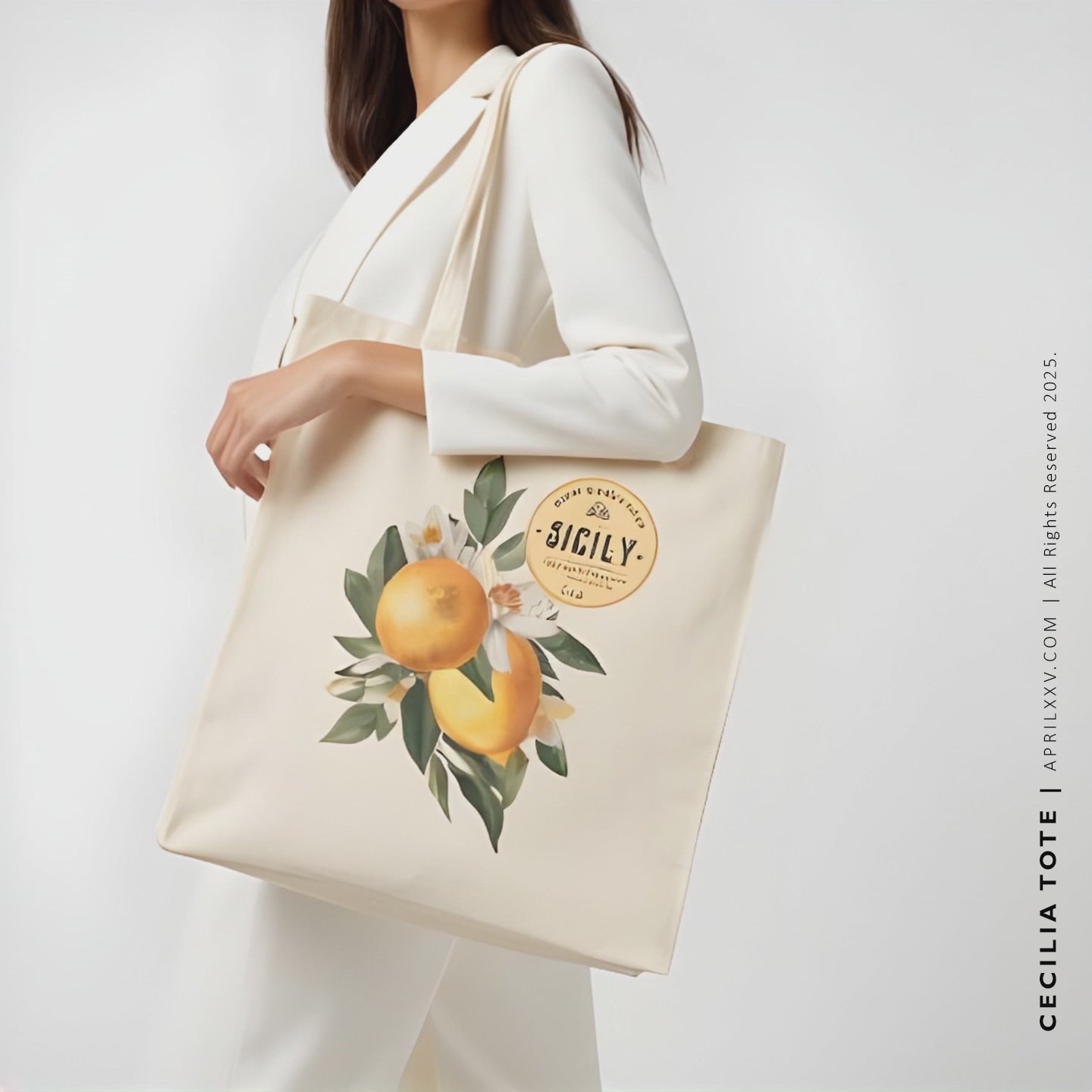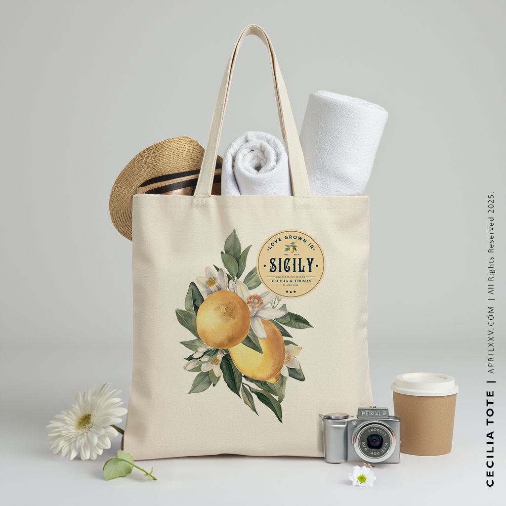 The CECILIA Canvas Tote is the perfect accessory for your next family trip or wedding in Sicily. This custom-made tote bag is convenient and holds everything you need for a fun and relaxing trip. The delicate Lemon botanical illustration makes this tote bag a stylish and unique gift for your bridal party or for any special occasion.