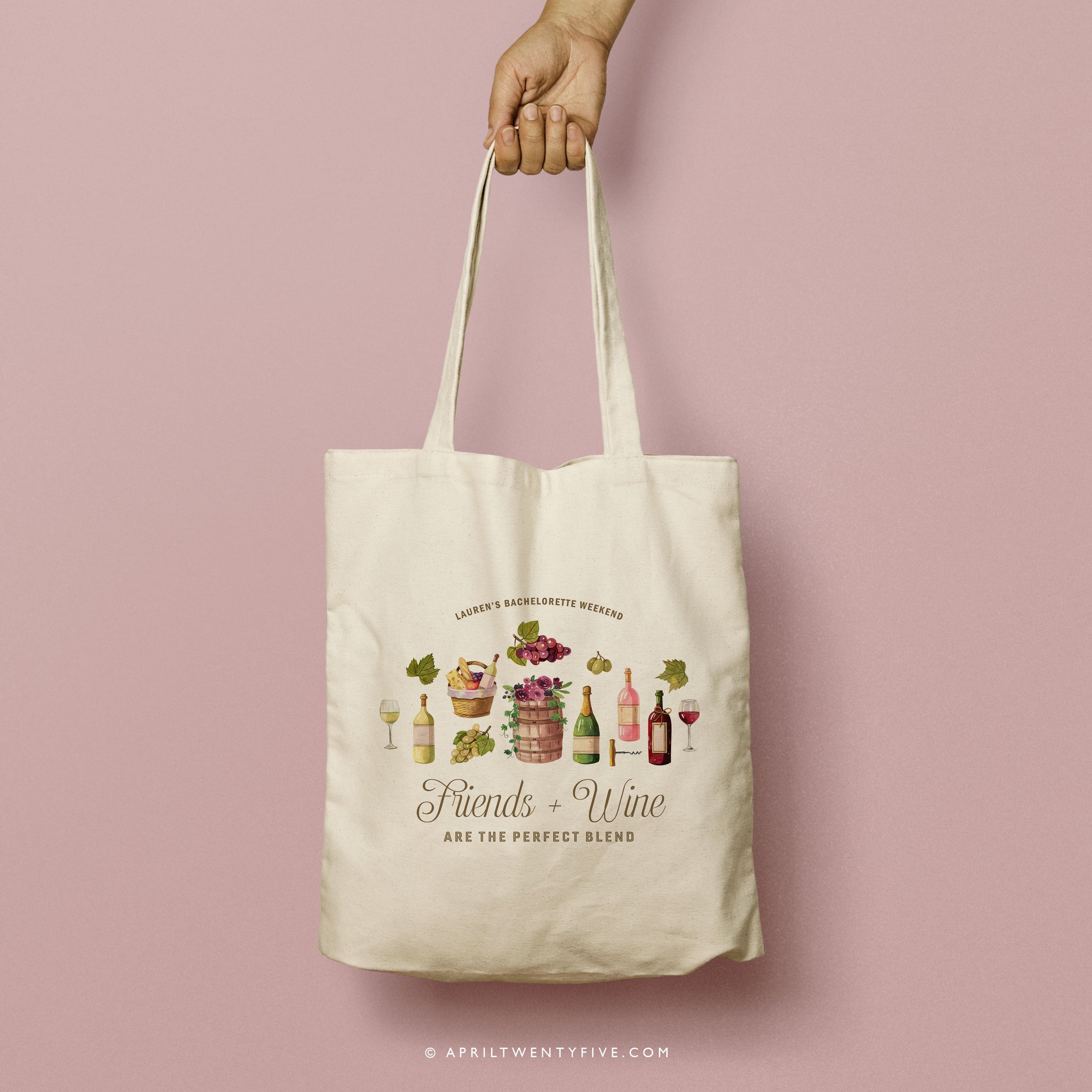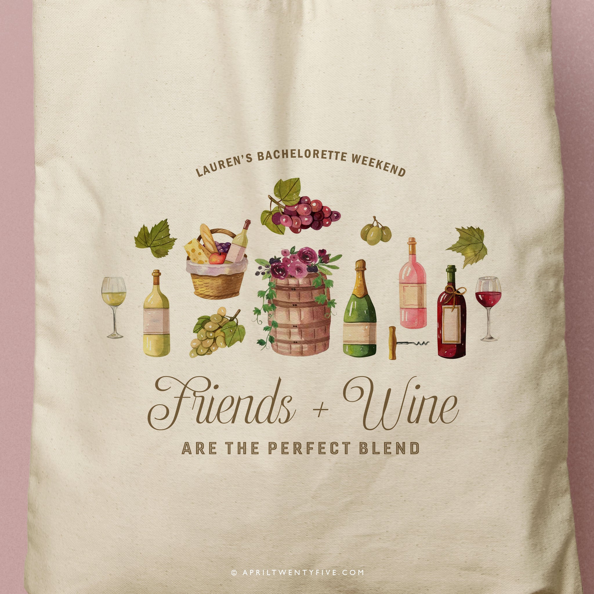 The Charlotte Grape Canvas Tote is the perfect accessory for your next trip to the Wine Country! This custom-made tote bag is convenient and holds everything you need for a fun and relaxing trip. The beautiful watercolor illustrations make this tote bag a stylish and unique gift for your bridal party, family or friends for any special occasion.