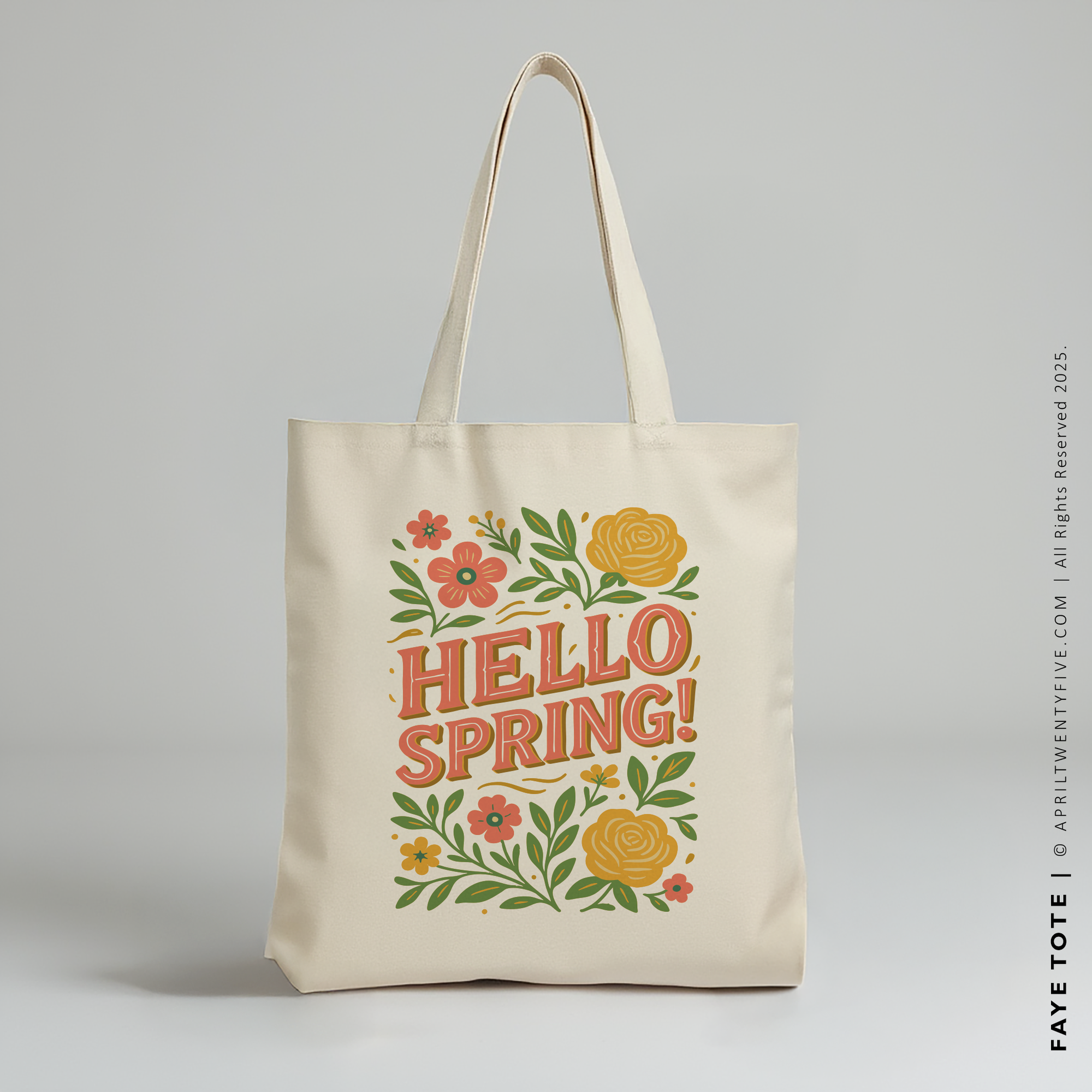 Looking for the perfect spring accessory? Discover the Faye Tote at AprilTwentyFive.com! This chic beige tote bag combines style and function, featuring vibrant floral designs and bold 'HELLO SPRING!' lettering that celebrate the season. Ideal for shopping trips or everyday essentials, this tote is a must-have for spring lovers. Designed with quality and charm, it's perfect for adding a touch of seasonal flair to your wardrobe. Shop now and embrace the joy of spring!