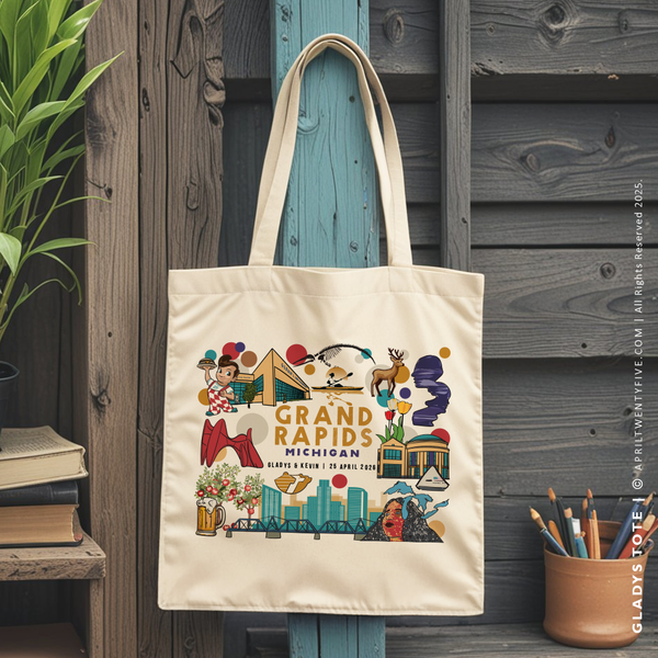 Celebrate Grand Rapids with this beautifully designed beige tote bag! Featuring a colorful illustration of iconic symbols—from city landmarks to wildlife—this tote is perfect for carrying essentials in style. Whether you're a local, a visitor, or celebrating a special occasion like Gladys & Kevin did on April 25, 2020, this bag makes for a wonderful keepsake.