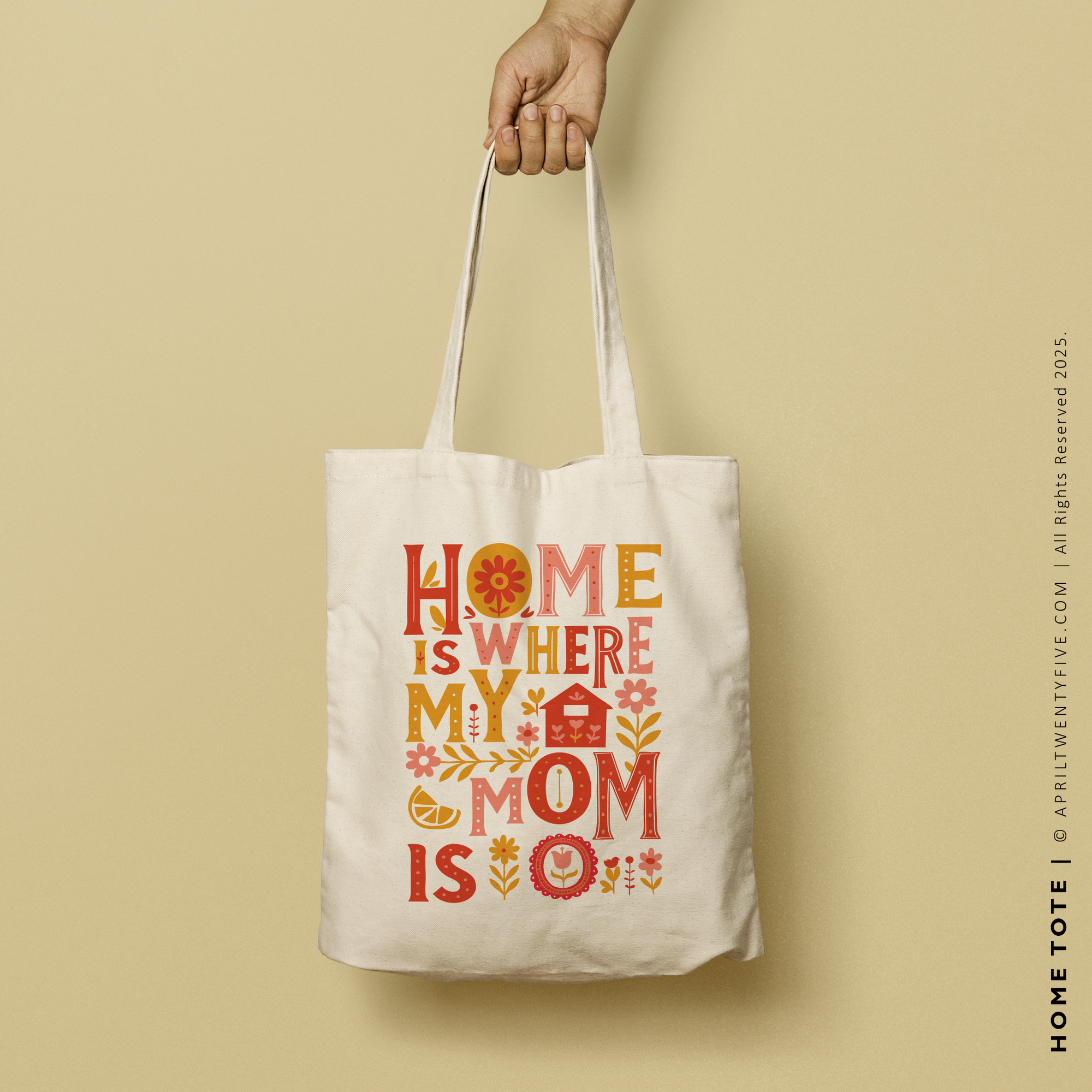 Celebrate the warmth and love of motherhood with this charming beige tote bag. Featuring the heartfelt phrase “Home Is Where My Mom Is” in vibrant red and yellow, along with beautiful floral and house-themed designs, this tote is both stylish and sentimental. Perfect for carrying everyday essentials, it’s a thoughtful and practical gift for moms who bring comfort and joy wherever they go. Ideal for Mother’s Day, birthdays, or just as a sweet surprise!