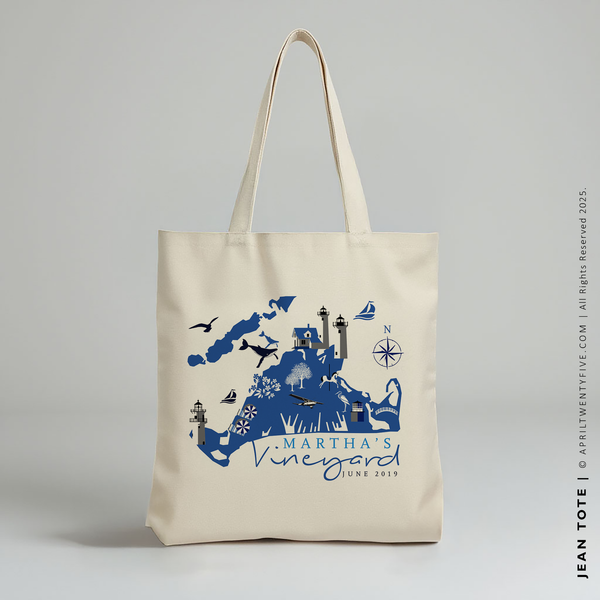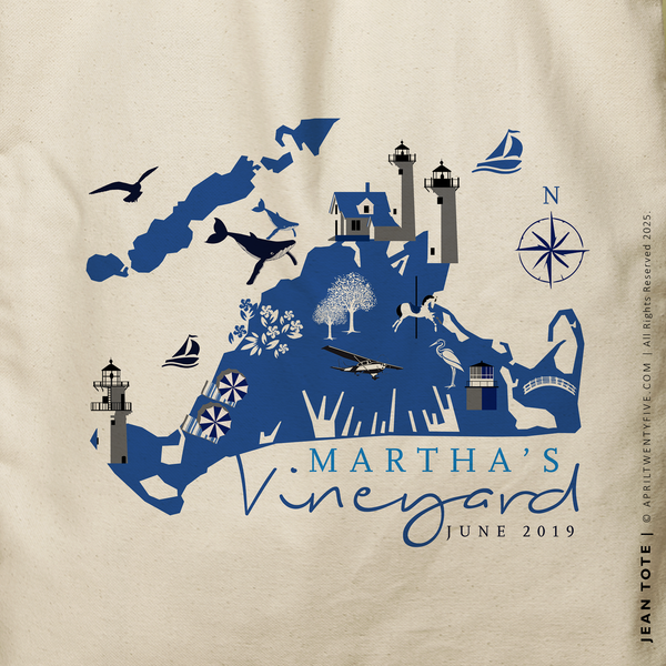 The JEAN Canvas Tote is the perfect accessory for your next family trip. This custom-made tote bag is convenient and holds everything you need for a fun and relaxing trip. The bold use of Martha's Vineyard's popular attractions makes this tote bag a stylish and unique gift for your bridal party or for any special occasion.
