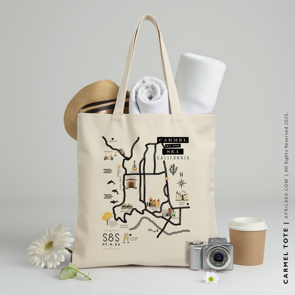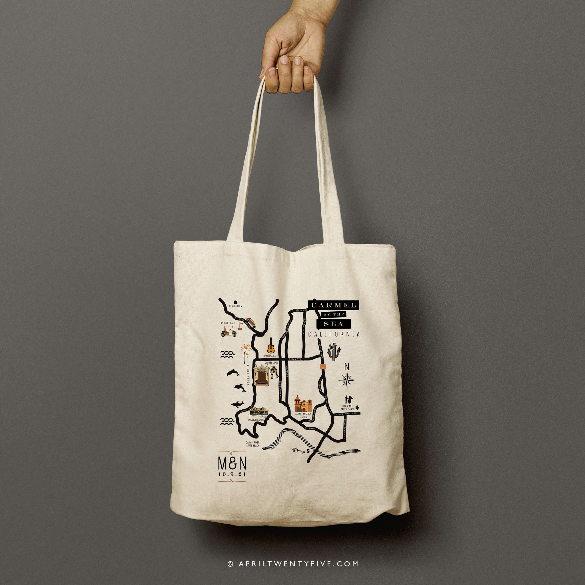 This beautifully illustrated custom canvas tote can be redesigned to feature any landmarks from your chosen destination. Just let us know where you intend to go, and we'll create the appropriate illustration for you. This tote features a collection of popular landmarks in the whimsical Carmel by the Sea, California.