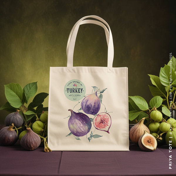 The PRIYA Tote is the perfect accessory for your next family trip or wedding in Turkey, Brazil or Greece (places where figs are popular). This custom-made tote bag is convenient and holds everything you need for a fun and relaxing trip. The delicate watercolor illustration makes this tote bag a stylish and unique gift for your bridal party or for any special occasion.