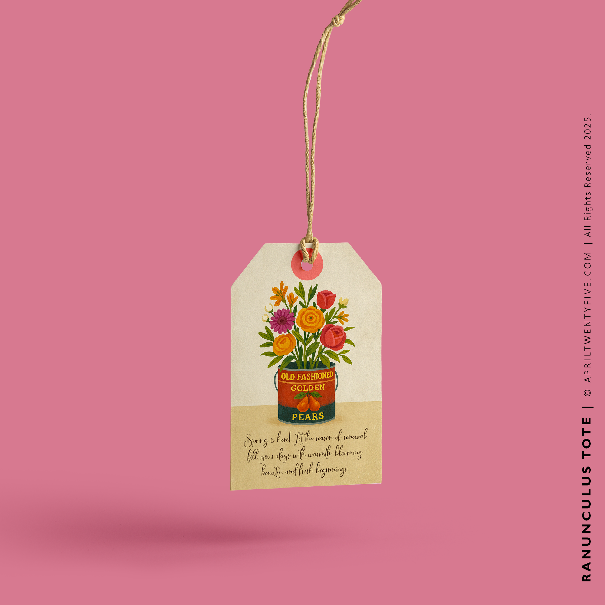 Add a touch of elegance and inspiration to your everyday essentials with the Ranunculus Tote by April Twenty-Five. This eco-friendly tote bag features a vibrant floral arrangement in a vintage-style 'Old Fashioned Golden Pears' pot, showcasing rich hues of red, orange, yellow, and purple flowers. The uplifting phrase 'Sow Kindness, Reap Happiness' beneath the design serves as a daily reminder to spread positivity and joy. Crafted for durability and style, this tote is perfect for carrying groceries, books, or personal belongings in a chic and sustainable way. Whether for yourself or as a thoughtful gift, the Ranunculus Tote is a beautiful blend of functionality and artistic flair. Shop now at AprilTwentyFive.com and let kindness blossom!