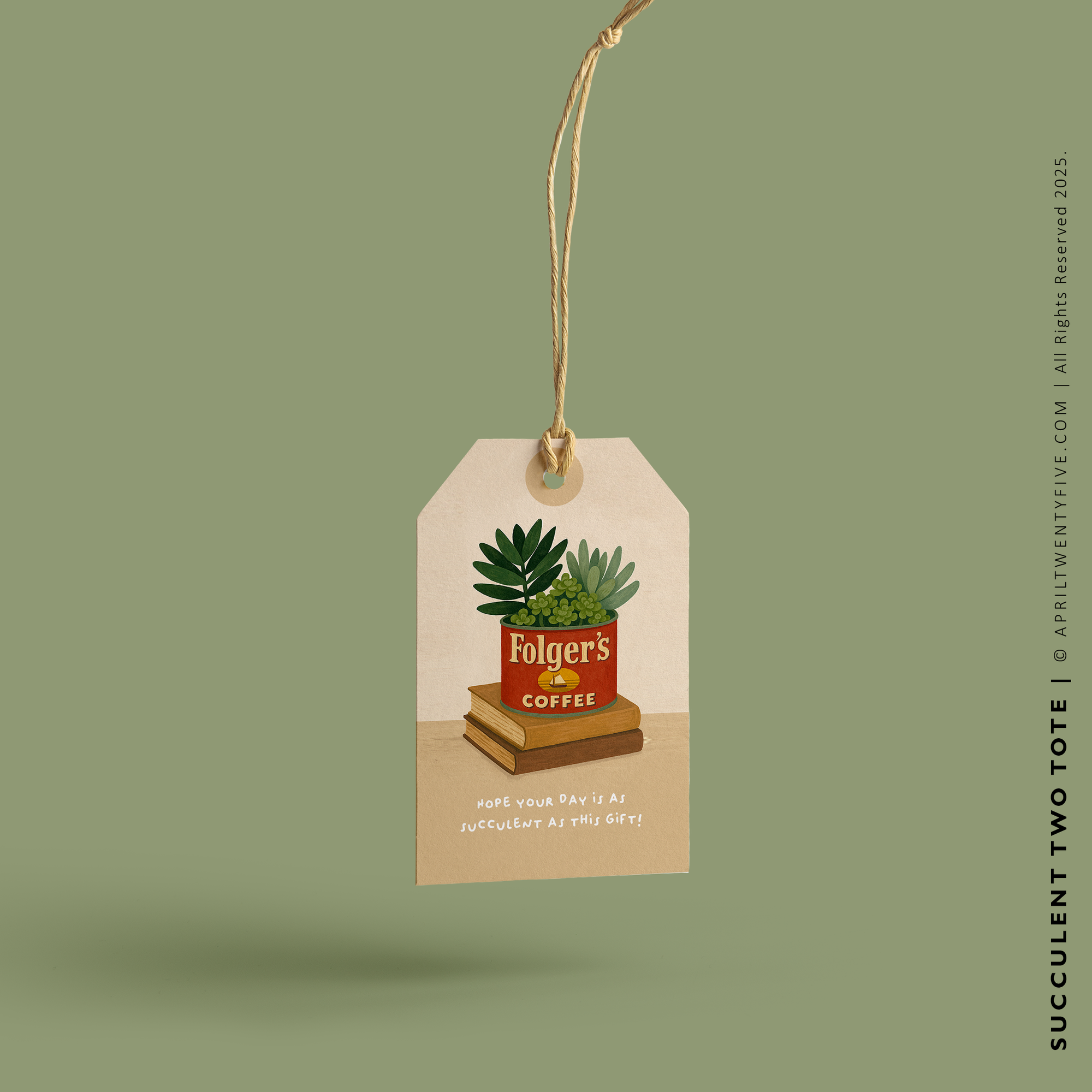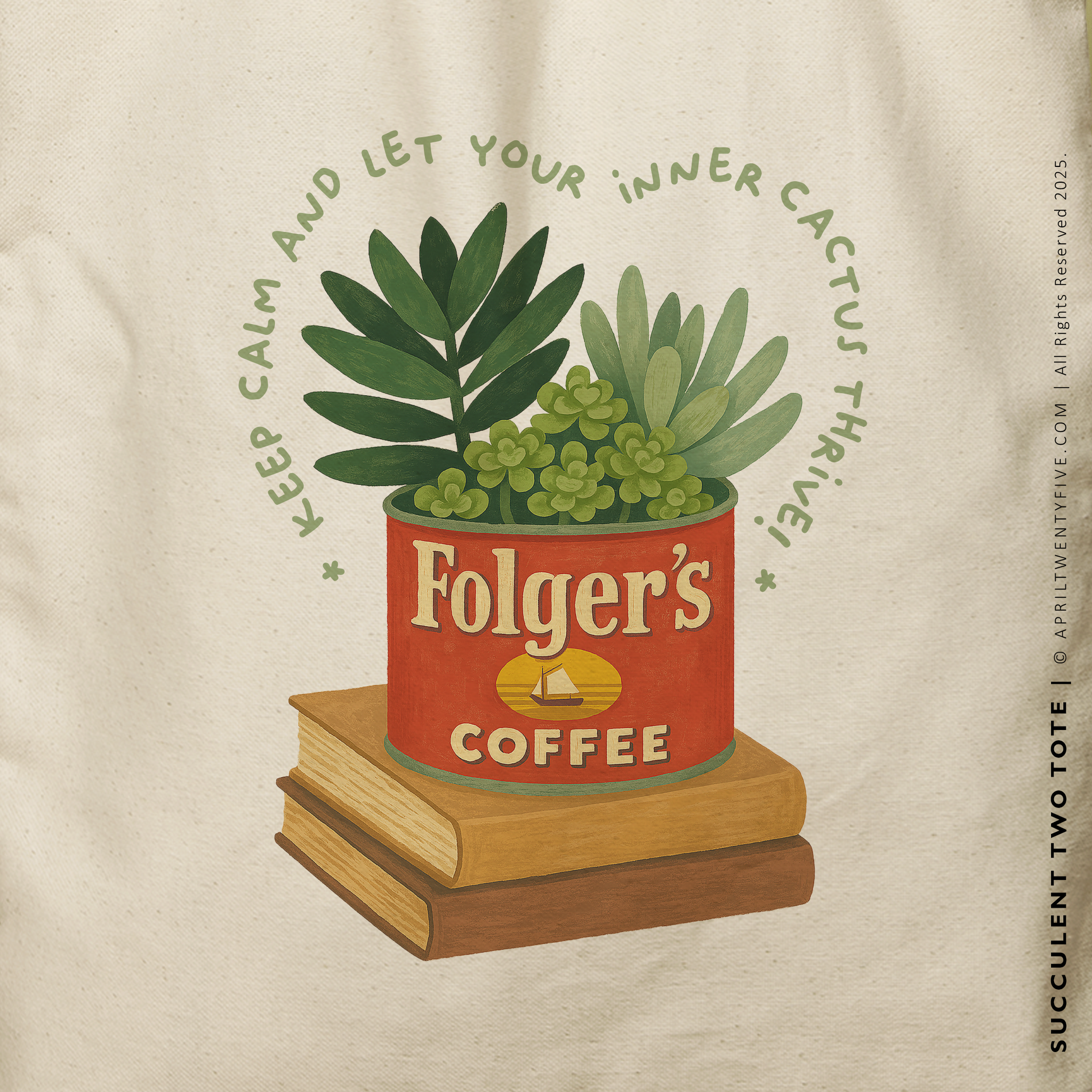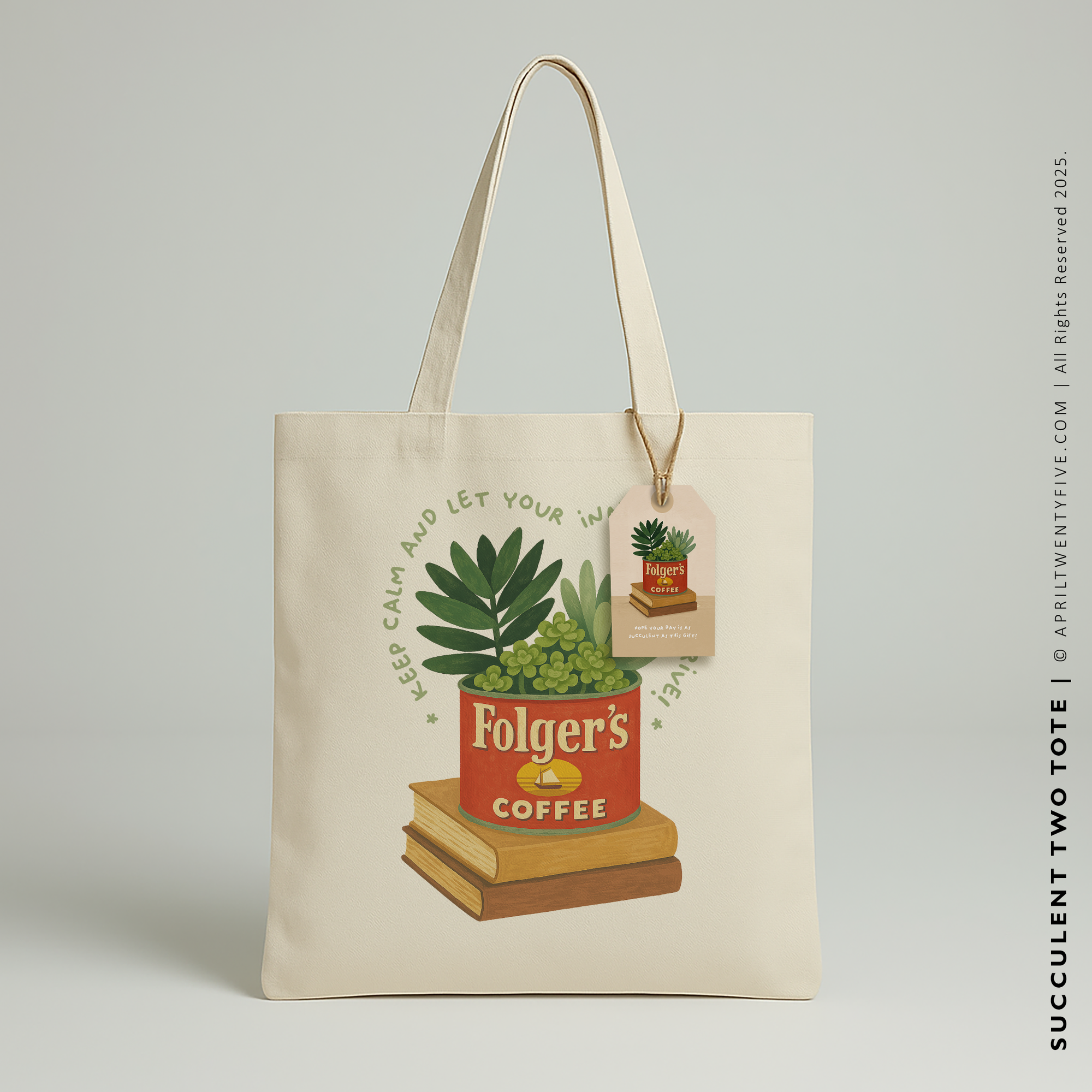 Elevate your everyday style with the SUCCULENT Tote Bag—a perfect blend of function, charm, and sustainability. This eco-friendly tote features a captivating design: a repurposed Folger’s coffee can thriving with vibrant succulents, resting atop a stack of vintage books. Accompanied by the uplifting phrase, "Keep Calm and Let Your Inner Cactus Thrive", this bag adds a touch of whimsy and positivity to your daily routine.