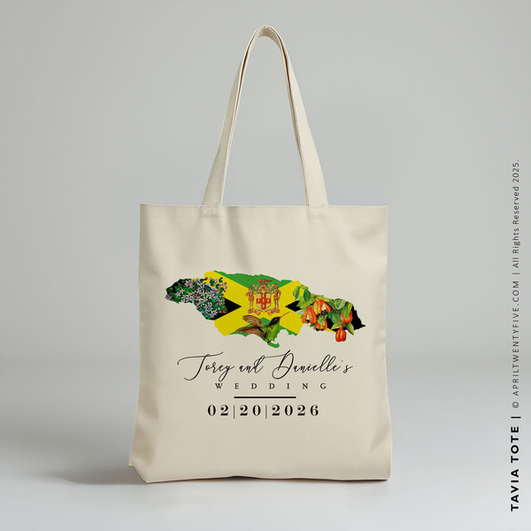Take your style on vacay with the Jamaican Tote. This custom-made canvas tote bag features the Jamaican flag, with its national icons like the Ackee fruit, Lignum Vitae flowers and the Red-billed Steamertail, making it perfect as a travel souvenir for group vacations, weddings, or as a gift for company trips. The tote bag is roomy enough to fit all your essentials, and the natural canvas is durable enough to withstand even the roughest adventures. Add your own text to make this tote bag even more personal.
