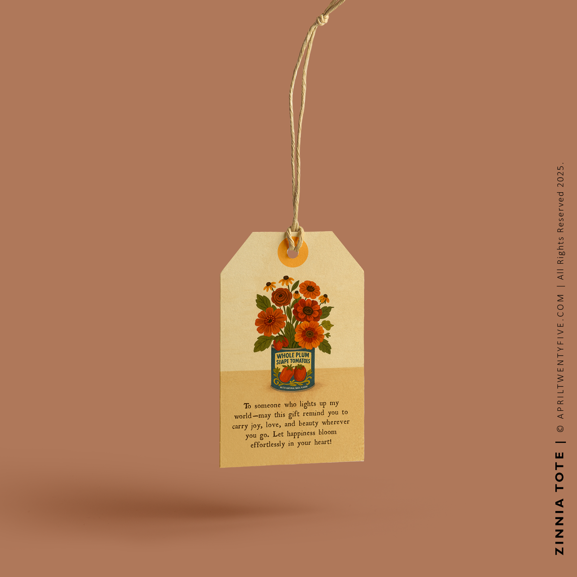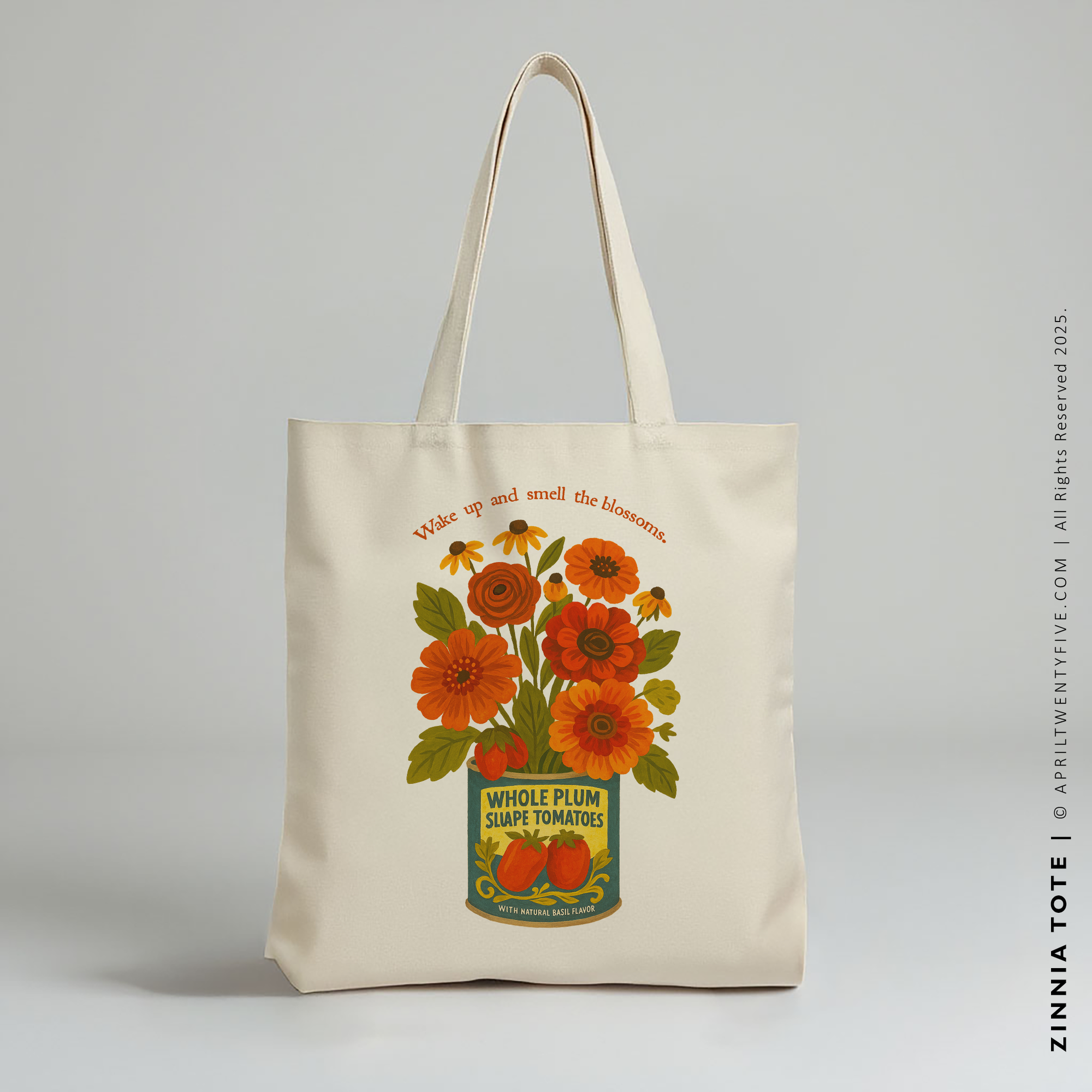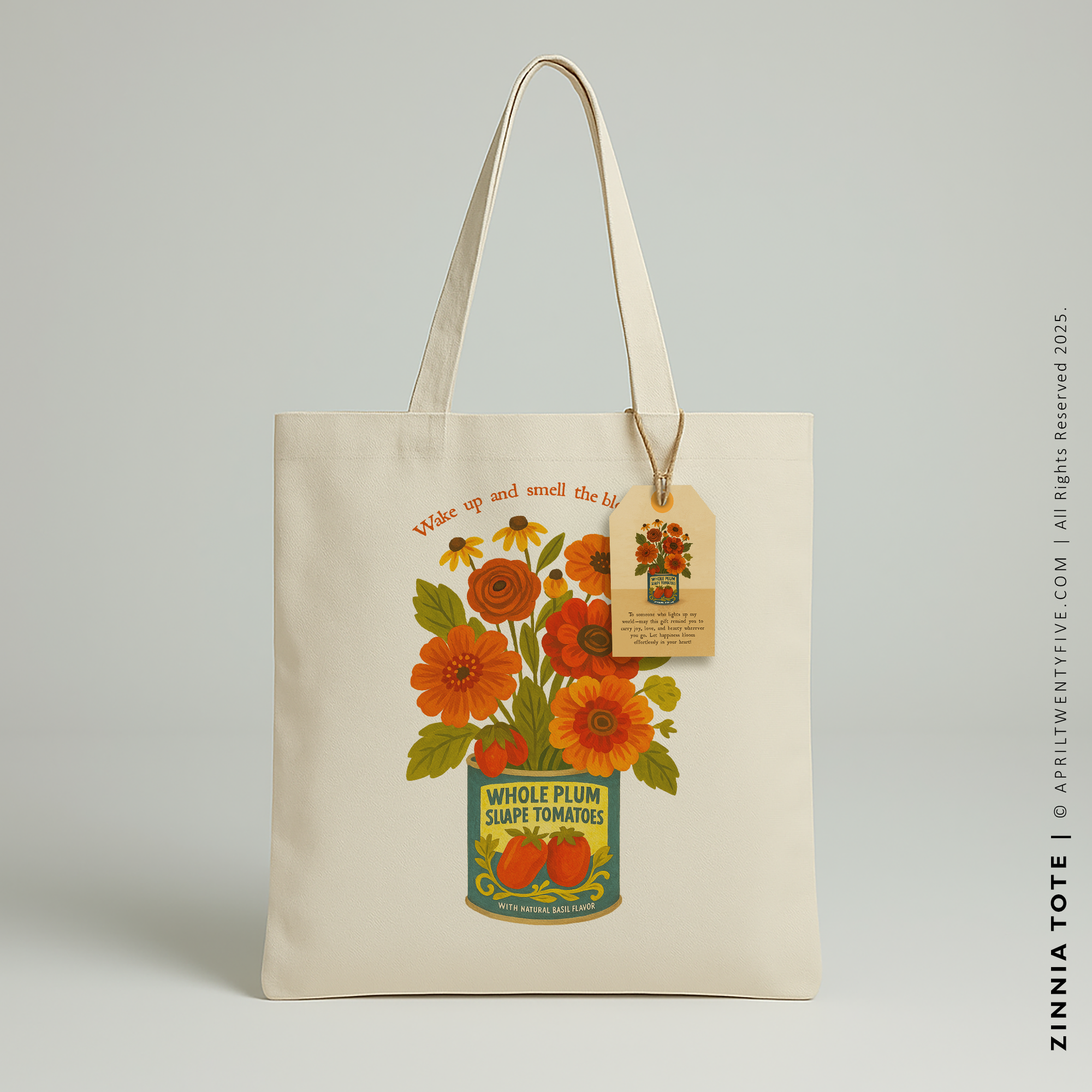 Enhance your style and sustainability with the Zinnia Tote by April Twenty-Five—a perfect blend of charm and functionality. This eco-friendly tote bag features a vibrant display of orange zinnias beautifully arranged in a vintage-inspired 'Whole Plum Shape Tomatoes' can. With the uplifting phrase 'Wake up and smell the blossoms' elegantly displayed above, this bag inspires positivity while adding a touch of artistic flair to your daily routine. Crafted from durable materials, the Zinnia Tote is perfect for carrying groceries, books, or everyday essentials in style. Make a bold and beautiful statement while supporting sustainability. Shop the Zinnia Tote today at AprilTwentyFive.com!