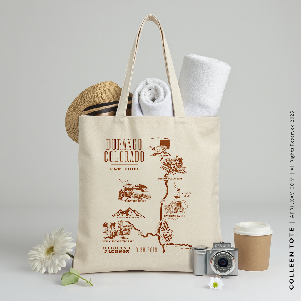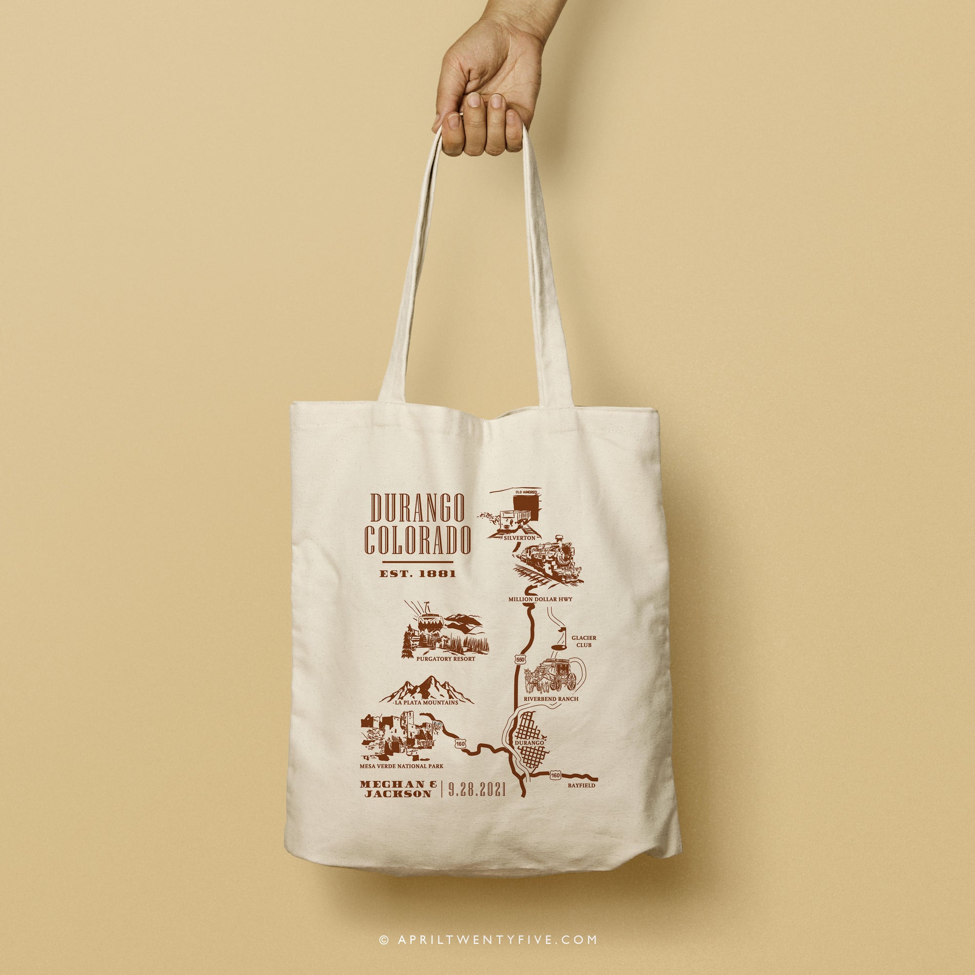 The Western-themed canvas tote is the perfect way to show your travel buddies some love. This custom-made canvas bag is heat-transfer-printed. It is the essential gift for your group vacation or for friends and family attending your destination wedding or a weeklong stay in Durango, Colorado. The best part? You can personalize it with your own text!