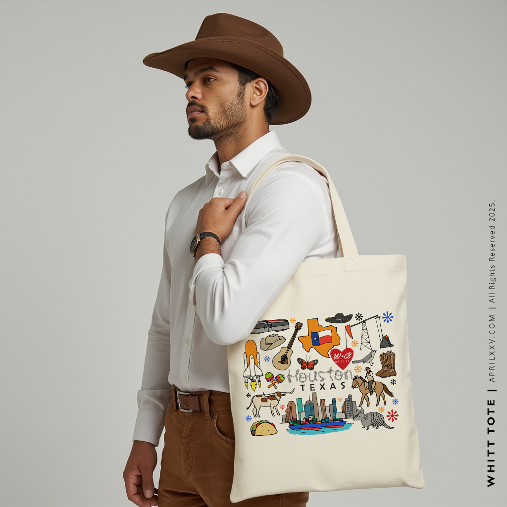 The April Twenty Five WHITT Houston, Texas tote is the perfect catchall for your next family trip. This bag is custom-made and features travel icons, making it the perfect gift for the for your favorite bridesmaids and the rest of your wedding guests. This bag is convenient and holds everything you need for a fun and stress-free trip to the Lone Star State!