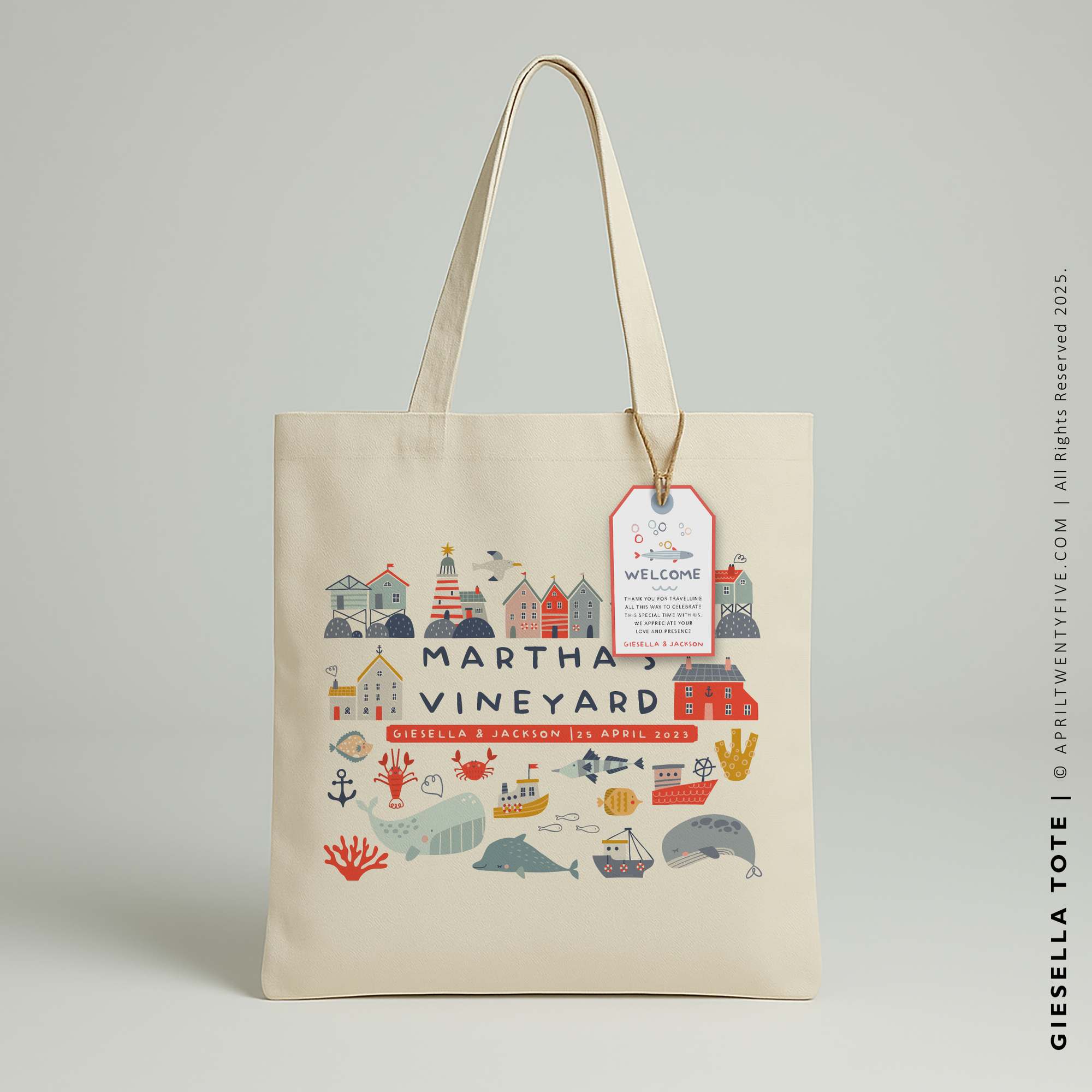 The GIESELLA canvas tote is the perfect accessory for your next family trip. This custom-made canvas tote bag is convenient and holds everything you need for a fun and relaxing trip. The bold use of Martha's Vineyard's popular attractions makes this tote bag a stylish and unique gift for your bridal party or for any special occasion.