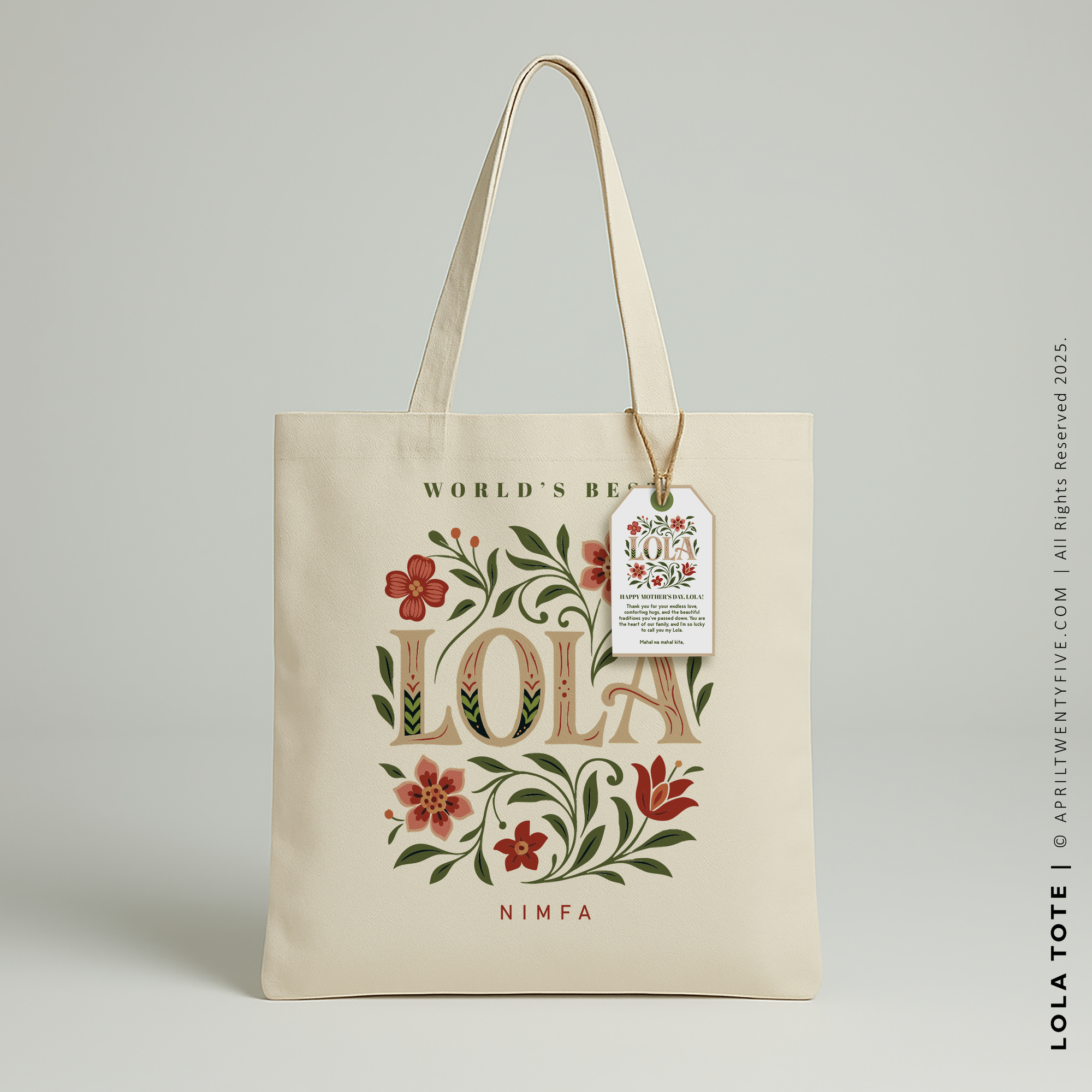 Celebrate the love and wisdom of your beloved Lola with this charming beige tote bag! Featuring elegant red and green floral accents and the title “World’s Best Lola”, this tote is both stylish and sentimental. Below the main design, the name Nimfa is beautifully personalized, adding a special touch. Whether she’s carrying groceries, books, or daily essentials, this bag is a practical and heartfelt gift to show appreciation for everything she does. Perfect for Mother’s Day, birthdays, or any special occasion!
