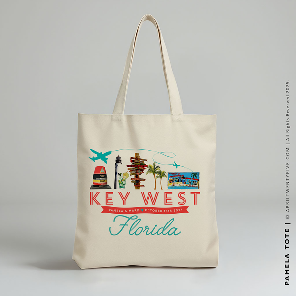 The April Twenty Five PAMELA Key West, Florida tote is the perfect catchall for your next family trip. This bag is custom-made and features travel icons, making it the perfect gift for the for your favorite bridesmaids and the rest of your wedding guests. This bag is convenient and holds everything you need for a fun and stress-free trip to the Florida Keys.