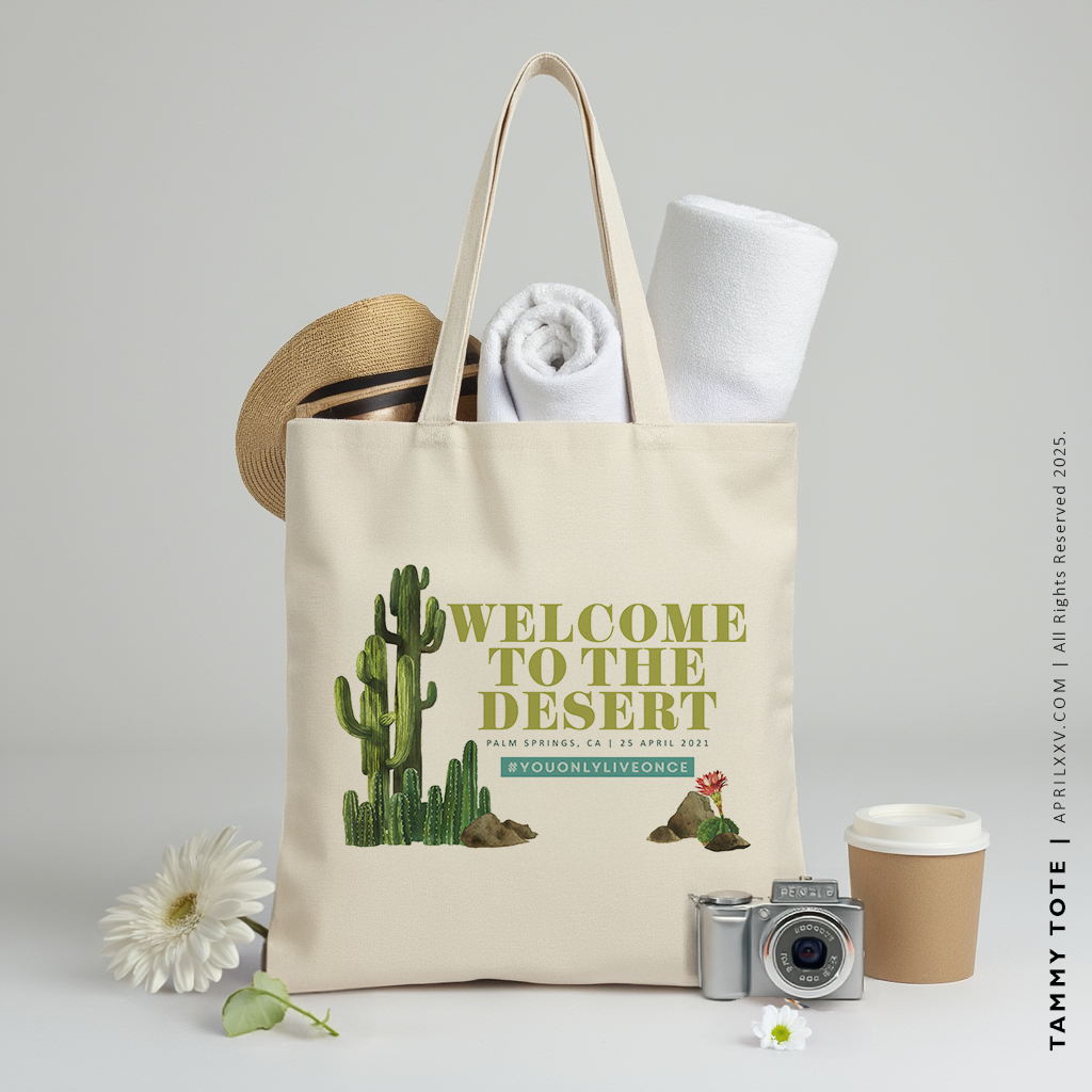 The TAMMY Tote is the best way to show your love for the city. This stylish desert-themed tote bag is perfect for carrying your everyday essentials, or for using as a souvenir tote for the gracious host of an Airbnb, a Girls Trip, a Boutique travel company. With its versatile design, this tote is a must-have for any occasion celebrated in the desert.