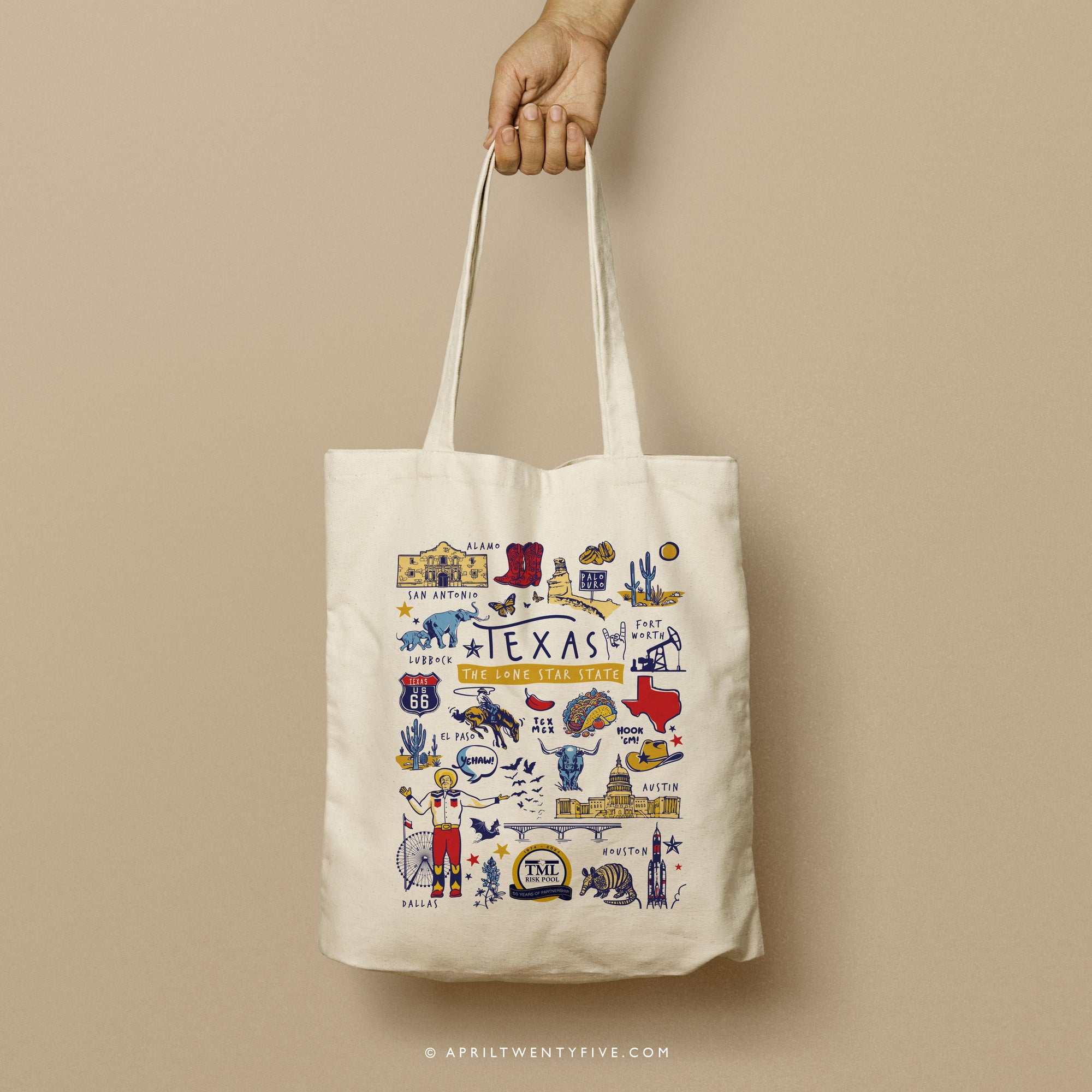 There's no lone star state of mind quite like this. Our TEXAS tote lets you wear your heart for the Lone Star State on your sleeve. . r shoulder, as it were. This roomy canvas carryall features retro-inspired "TEXAS" lettering and lone star graphics that evoke nights at the rodeo and two-steppin' at the honky tonk. Whether you're a tried-and-true Texan or just wish you were, this stylish tote will have you yellin' "yeehaw!" in no time. Made of durable canvas, it's perfect for beach days, road trips to Big Bend, or just adding a touch of wild west style to your everyday. Saddle up and head out in style with this ode to the big, bold spirit of the great state of Texas! Y'all come back now, ya hear?