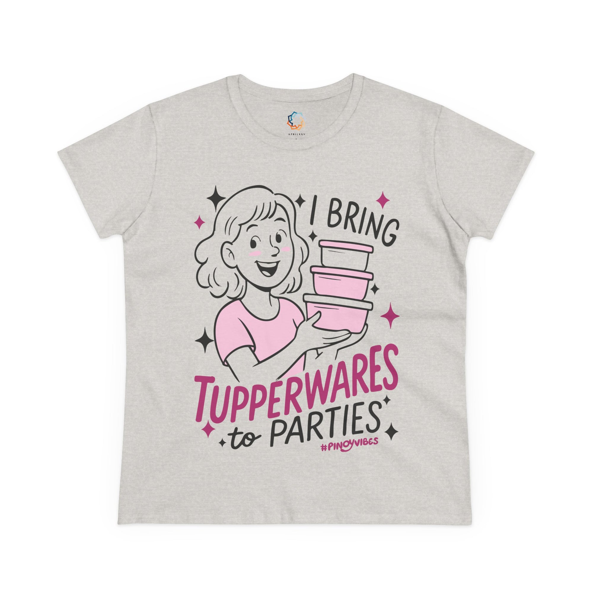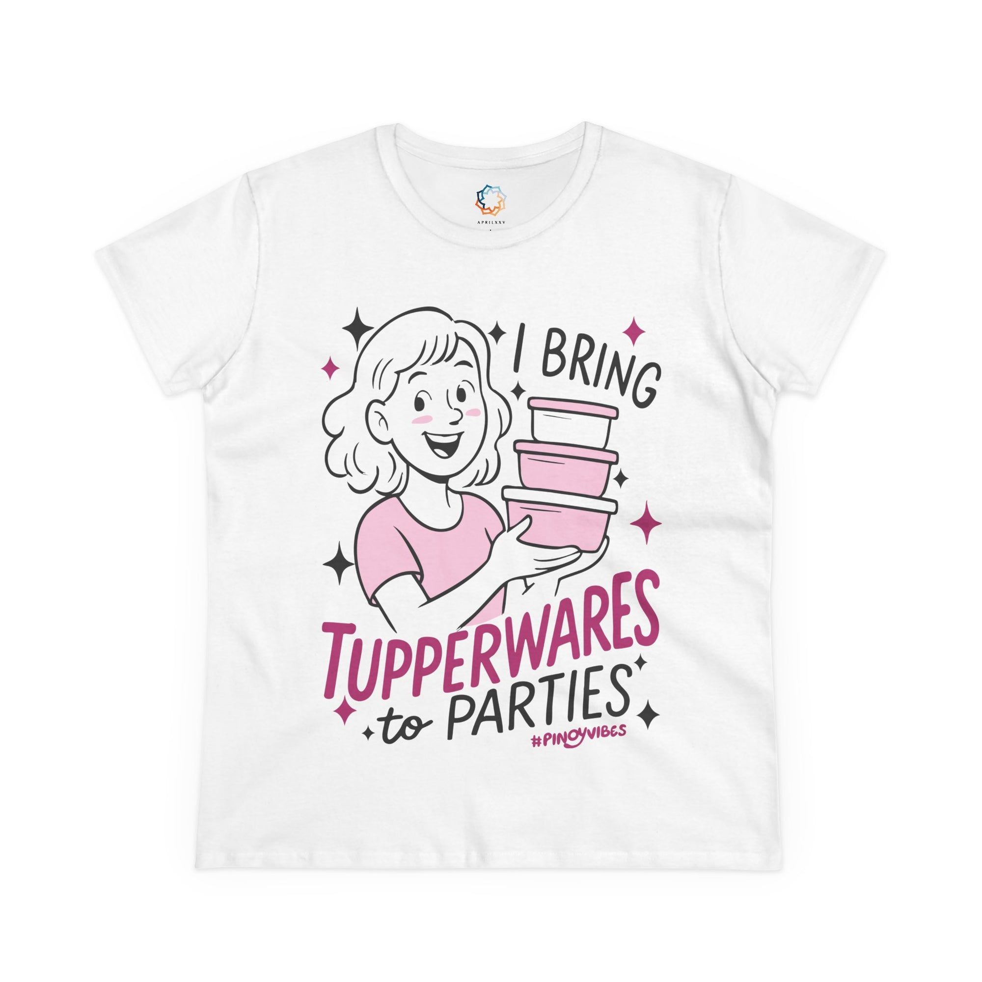 Casual t-shirt for women who bring tupperware to parties. Perfect for those who love to be prepared and organized. Great for gatherings, potlucks, and casual get-togethers.